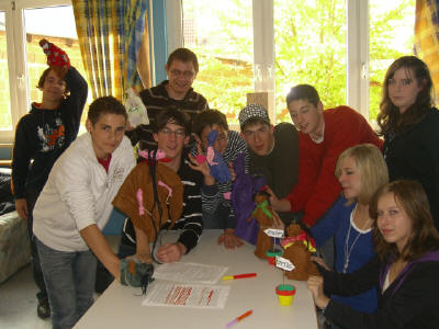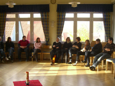 Um 11.30 Uhr begannen wir mit der Übung für die Aufführung des Evangeliumsteils „Die Begegnung mit dem Auferstandenen auf dem Weg nach Emmaus“. Die erste Gruppe machte eine pantomimische Aufführung, die zweite eine Collage, die dritte ein Schauspiel und die vierte Gruppe machte ein Knotenpuppenspiel. Mittagessen gab es um 13.00 Uhr. Die Aufführung des Evangeliumsteils begann um 14 Uhr. Verschiedene Workshops konnten ab 15.00 Uhr belegt werden. Unter anderem die Gestaltung eines Adventskalendertürchens der Firmgruppe 2008. Es konnten aber auch ein Banner gestaltet werden. Kaffee und Kuchen gab es um 17.00 Uhr. Um 17.30 Uhr begann die Gottesdienstvorbereitung. Es wurde die Predigt vorbereitet, die Fürbitten, das Kyrie-Tagesgebet und das Schlussgebet geschrieben. Die Gruppe ging gemeinsam um 18.30 Uhr in die Kirche, in der um 19.00 Uhr der Gottesdienst begann.