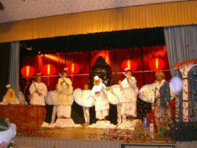 Ins „Land des Lächelns“ entführten die kfd-Frauen ihr Publikum und sorgten vor stimmungsvoller asiatischer Kulisse im Gemeindezentrum wieder für einen tollen Fastnachtsabend. Die Veranstaltung begann olympisch mit Fahneneinzug, Fackelträger und Sportlerinnen, wobei vor allem die Sumo-Ringer für Lacher sorgten. Zu Gast war die Kindergarde aus Müs, die einen Piratentanz mitbrachte. Himmlisch wurde die Kulisse, als eine schusselige Hausfrau Hilfe vom Heiligen Antonius und seinen Kollegen erhielt. Das Publikum lernte aus der Bütt, wie man am Buffet absahnen kann, bestaunte einen singenden Baum mit seinen reifen Pflaumen und lauschte den Einsichten eines Ballonfahrers. Der Karnevalsverein Bad Salzschlirf mit Prinz Norbert marschierte ein und ließ Prinzenmariechen Svenja tanzen. Ein Wetterhäuschen stellte den Jahresablauf mit vielen Aktiven vor. Eine schwere Rechenaufgabe versuchte eine bäuerliche Familie zu lösen. Loriots „Kosakenzipfel“ sorgte für köstlichen Streit. Nach einem musikalischen Kostümreigen zum menschlichen Lebenslauf gab es ein hessisches „Dinner for One“ und das große Finale mit Kimono-Tanz.