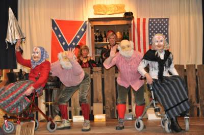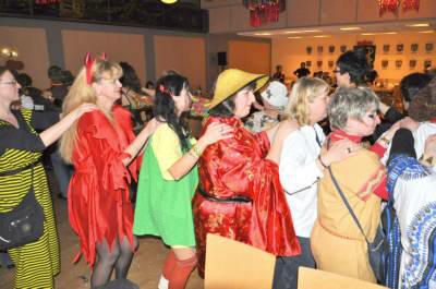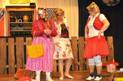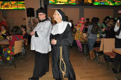 Dazu gehörten ein Tanz im Saloon genauso wie ein typischer „Line Dance“. Die Lacher auf ihrer Seite hatte das Senioren-Pärchen im Sanitätshaus auf der Suche nach den besten Stücken für den Hochzeitstisch. Als „Trauerschnallen“ sorgten die kfd-Frauen dafür, dass kein Auge trocken blieb. Im Himmel war der Teufel los und musste mit seinen Gehilfen Christkind und Nikolaus auf den neuesten Stand bringen, damit der himmlische Geschenke-Service funktioniert. Beim „Masken-Tanz“ verwandelten sich vier junge fesche Damen in Omas und Opas. Süße Früchte in angesagter Harmonie brachten die Medi-Fit-Trainerin auf die Idee, ihren Schnupperkurs und den gesamten Saal zu entspannenden Fitness-Übungen zu animieren. Die St. Vitus-Apotheke lieferte kirchenkonforme Rezepte für jedes Problem, stets versetzt mit „Spiritus sanctus“. Pfarrer Robert Wajda bewährte sich als Gesundheitsberater und konnte sich vor Lachen dabei kaum halten. „In der Bar“ gab es Völkerverständigungsprobleme beim Flirten, während beim „Internatsbesuch“ familiäre Miss-Verhältnisse ausgeplaudert wurden.