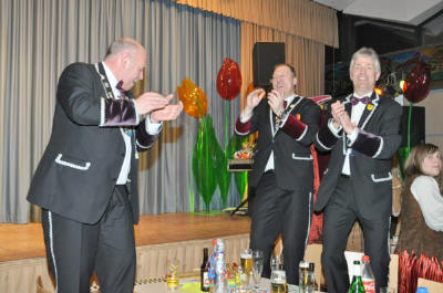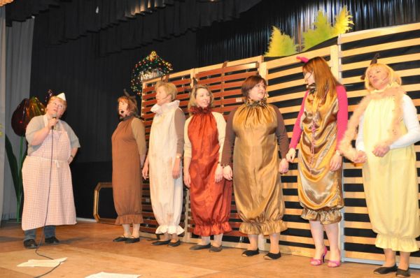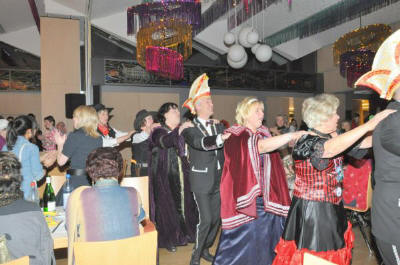 kfd-Präses Pfarrer Robert Wajda betrat die Bühne als wissensfreier Prüfling, der seine Professorin Eva Stein aus der Fassung brachte. Mit ein Höhepunkt waren die „Foarsetewürscht“ (Andrea Blum, Jutta Dimmerling, Ingrid Schüler, Nicole Brehler, Elena Post, Ulrike Schlei) auf dem Grill und ihr Grillmeister Beate Blotenberg. Vier Pinguine (Marianne Otterbein, Claudia Lehmann, Eva Stein und Andrea Post) legten eine muntere Watschel-Sohle aufs Bühnenparkett. Ehepaare, die im Jahr 2063 leben und seit 5 Jahren keine Kinder gezeugt haben, erhalten Besuch von einem Regierungsangestellten, der der Frau des Hauses zum Nachwuchs verhilft, erfuhr man zu dem Sketch aus der Zukunft. Andrea Post als brave Hausfrau hielt den Besucher (Marianne Otterbein) für den Mann vom Amt, dabei war das nur ein Fotograf. Wie eine Unterhaltung dann eindeutig zweideutig ausgelegt wurde, konnten die Gäste im Saal mitverfolgen. Ein Kanarienvogel strapazierte das sowieso schon „eingerostete“ Eheglück eines altes Paares (Andrea Post und Eva Stein), bevor die kfd-Frauen Alexandra Otterbein, Nicole Brehler, Ulrike Schlei, Andrea Blum, Ingrid Schüler, Maria Post, Elena Post, Jutta Dimmerling, Claudia Lehmann und Andrea Post ihren flotten Showtanz von Foxtrott bis zu Rock and Roll präsentierten.