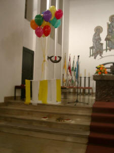 An der Ministrantenkonferenz, die am 07.10.06 statt fand, trafen sich 60 Ministranten aus 20 Pfarreien des Bistums Fulda in der Pfarrei St. Josef in Fulda. Darunter waren auch zwei Mini´s aus unserer Pfarrei vertreten. Die Konferenz begann mit der Begrüßung des KJG –Teams, welches alle Messdiener sehr herzlich willkommnen hieß. Bevor es richtig Los ging, lernten wir uns im Rahmen eines Spieles kennen. Danach stellten die Mini´s per Plakat ihre Pfarreien vor. Während der Pause konnten sich die Teilnehmer beim Mittagessen durch Gespräche austauschen. Um 14.00 Uhr ging es mit Workshops wie z.B: Nachwuchsarbeit, JuGo, regionale Vernetzung, Ausbildung von Leitern, die eine Ministrantengruppe leiten sollen,… usw. weiter. Bei der Präsentation der verschiedenen Workshops kam man zum Ergebnis, dass der Bedarf des Austausches unter den einzelnen Messdienergruppen groß ist. Unter anderem ist der Zusammenhalt, sowohl in der Gruppe, als auch mit den anderen Gruppen, sehr wichtig. Nach der Reflexion feierten die Messdiener mit der Pfarrei einen Jugendgottesdienst, der vom Diözesanjugendpfarrer Sebastian Blümel zelebriert wurde. In seiner Predigt ging es darum, dass, wenn einer einen Traum hat, er ihn nicht allein verwirklichen kann. Aber wenn alle an einem Traum festhalten und wenn jeder etwas für den Traum macht, dass er dann auch Realität annimmt. Dies wurde an Hand von Luftballons demonstriert. Während ein aufgeblasener Luftballon als ein einzelner Traum zerplatzte, konnten viele Luftballons eine Platte tragen. Es war für alle Mini´s, die sich in der Ministrantenarbeit verantwortlich fühlen, ein informativer und lehrreicher Tag. Bericht und Foto: Alexandra Reus |