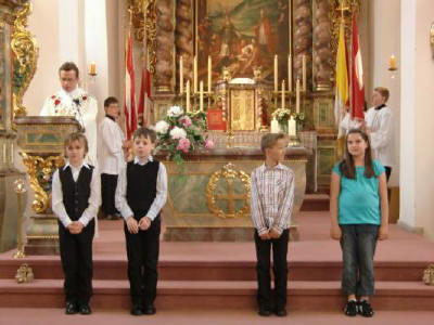 Nachwuchs bekam in der Messe die Ministrantenschar von St. Vitus: Pfarrer Wajda nahm vier Kommunionkinder als neue Messdiener auf. Lara Balandjuk, Paul Bodynek, David Gulyas und Laurenz Martin gelobten, die Pflichten eines Messdieners für St. Vitus zu erfüllen.
