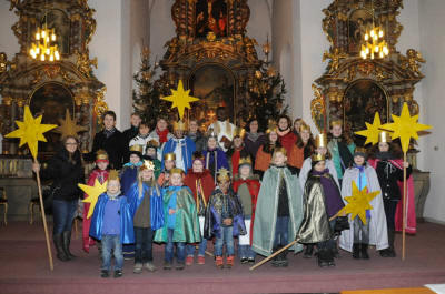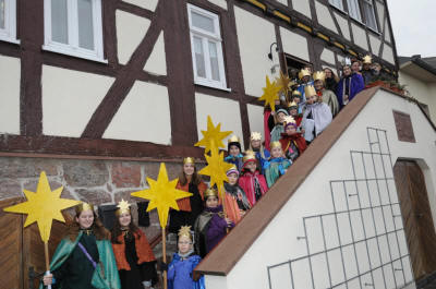 bunte Dreikönigsschar in sieben Gruppen auf den Weg durch unseren Ort. Zuvor