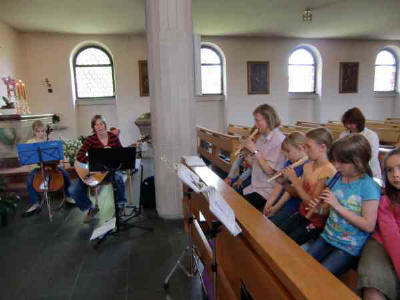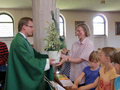 Tränen bei den Kindern und auch bei manchen Müttern gab es, als Pfarrer Wajda die Leiterin der Kinderschola Arche Noah, Eva Seifert, verabschiedete. In der letzten Schülermesse vor den Sommerferien 2010 gab es den letzten Auftritt mit Eva Seifert und ihrem Chor. Vor acht Jahren hatte die Musikpädagogin den Kinderchor Arche Noah von Silvia Groß übernommen und mit ihren jungen drei bis 11 Jahre alten Sängerinnen und Sängern nahezu jeden Samstagvormittag im Pfarrheim geprobt. Nach und nach waren zum Gesang Flöten, ab und zu auch ein Cello, Keyboard und Gitarre hinzugekommen. Viele Gottesdienste, Besuche in den Altenheimen und manche Veranstaltungen begleitete die Kinderschola mit ihrem Gesang und Spiel. Unvergessen bleiben die aufgeführten Singspiele „Die Heinzelmännchen von Köln“, „Frau Holle“ und „Arche Noah.“ „Die Eltern waren begeistert, die Kinder lieben Sie“, so brachte Pfarrer Wajda die Bewunderung für den musikalischen Elan von Eva Seifert auf den Punkt. Von der Pfarrgemeinde gab es ein herzliches Dankeschön für all die Musik zu Ehren Gottes und ein Blumenpräsent. „Ich gehe ja nicht weg“, meinte Eva Seifert ganz gerührt, und sie versprach, auch zukünftig mit ihrer Instrumentalgruppe einmal in der Kirche zu musizieren. Sie dankte den Eltern, die ihre Kinder immer zu den Proben und Auftritten geschickt hatten. „Es war eine schöne Zeit“, schwärmte sie lächelnd. Und sie freute sich, dass schon zwei Nachfolgerinnen als Scholaleiterinnen gefunden sind: Christina Schulze und Nathalie Baroke werden zukünftig die Arche-Noah-Kinder mit der Kirchenmusik für die Jüngsten vertraut machen, die Übungsstunden leiten und die Auftritte durchführen.
